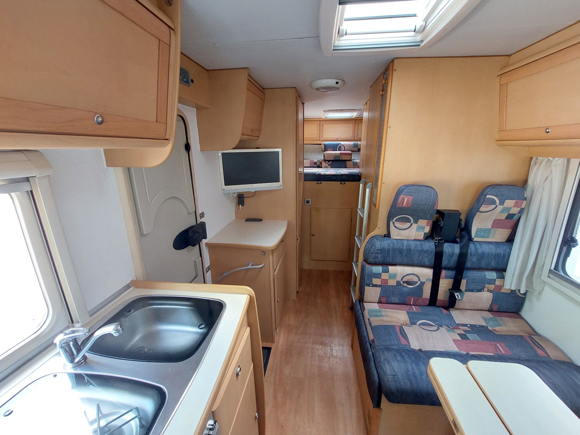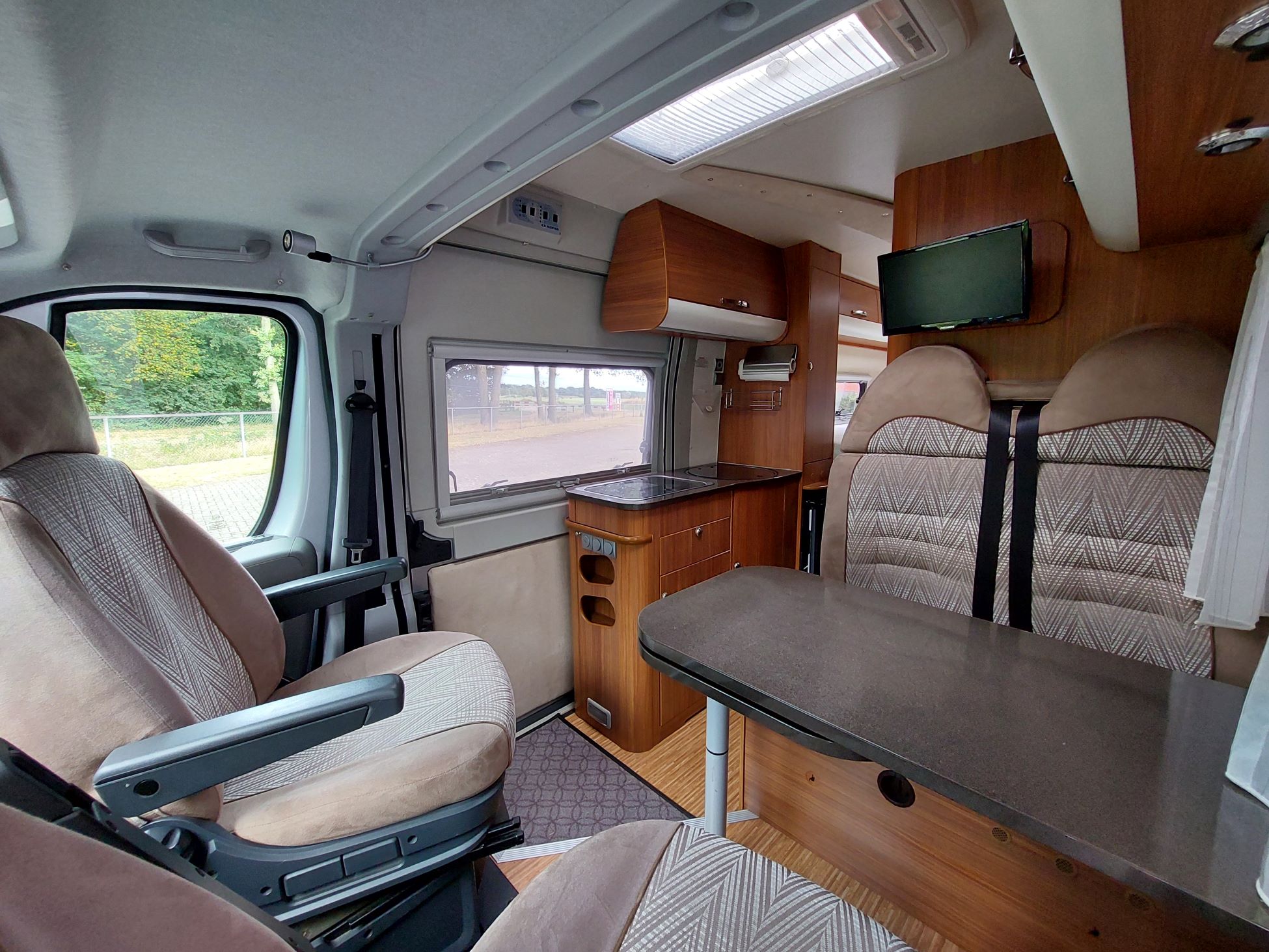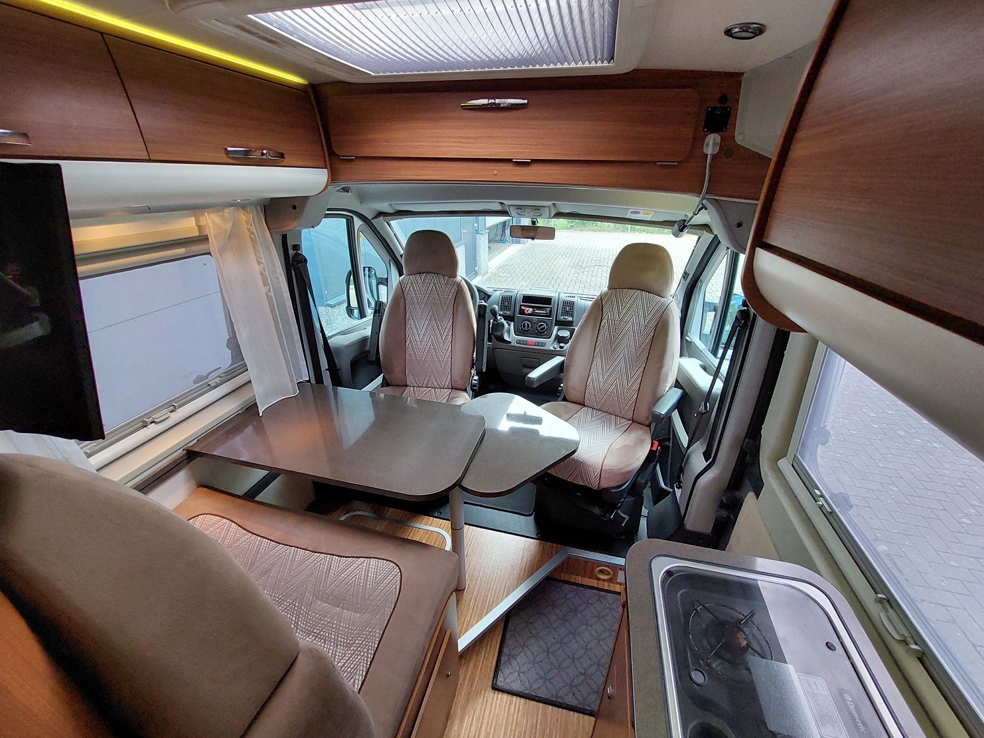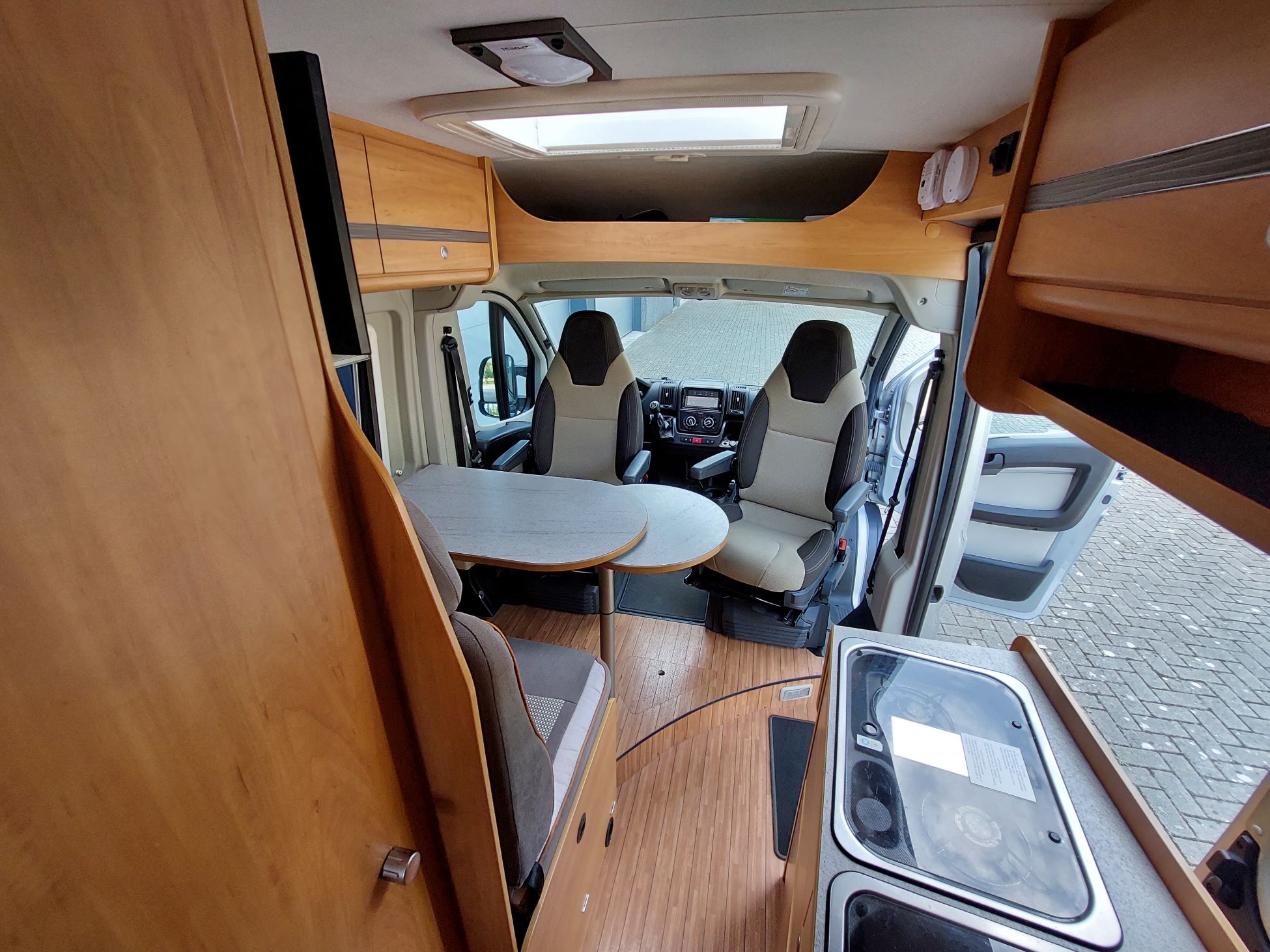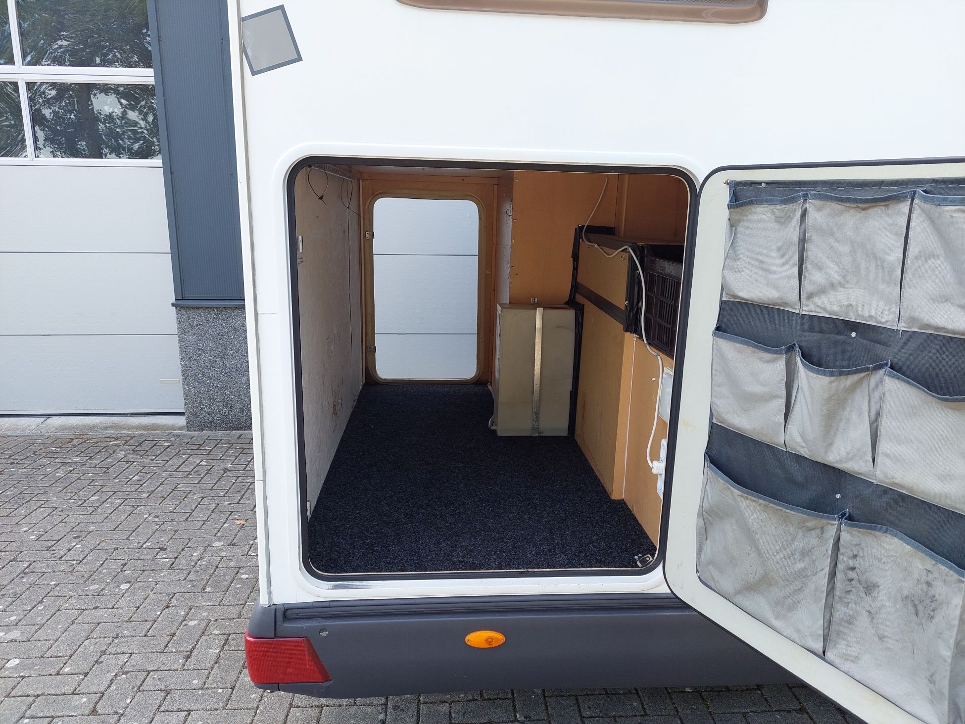 Ruime halfintegraal met ruime garage, 5 zitplaatsen op kenteken, 2 bijdraaibare stoelen, vast 2 persoons bed en L zit om te bouwen tot 2 slaapplaatsen.