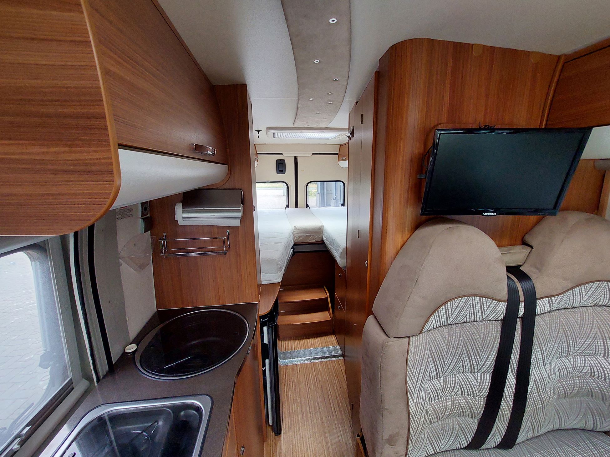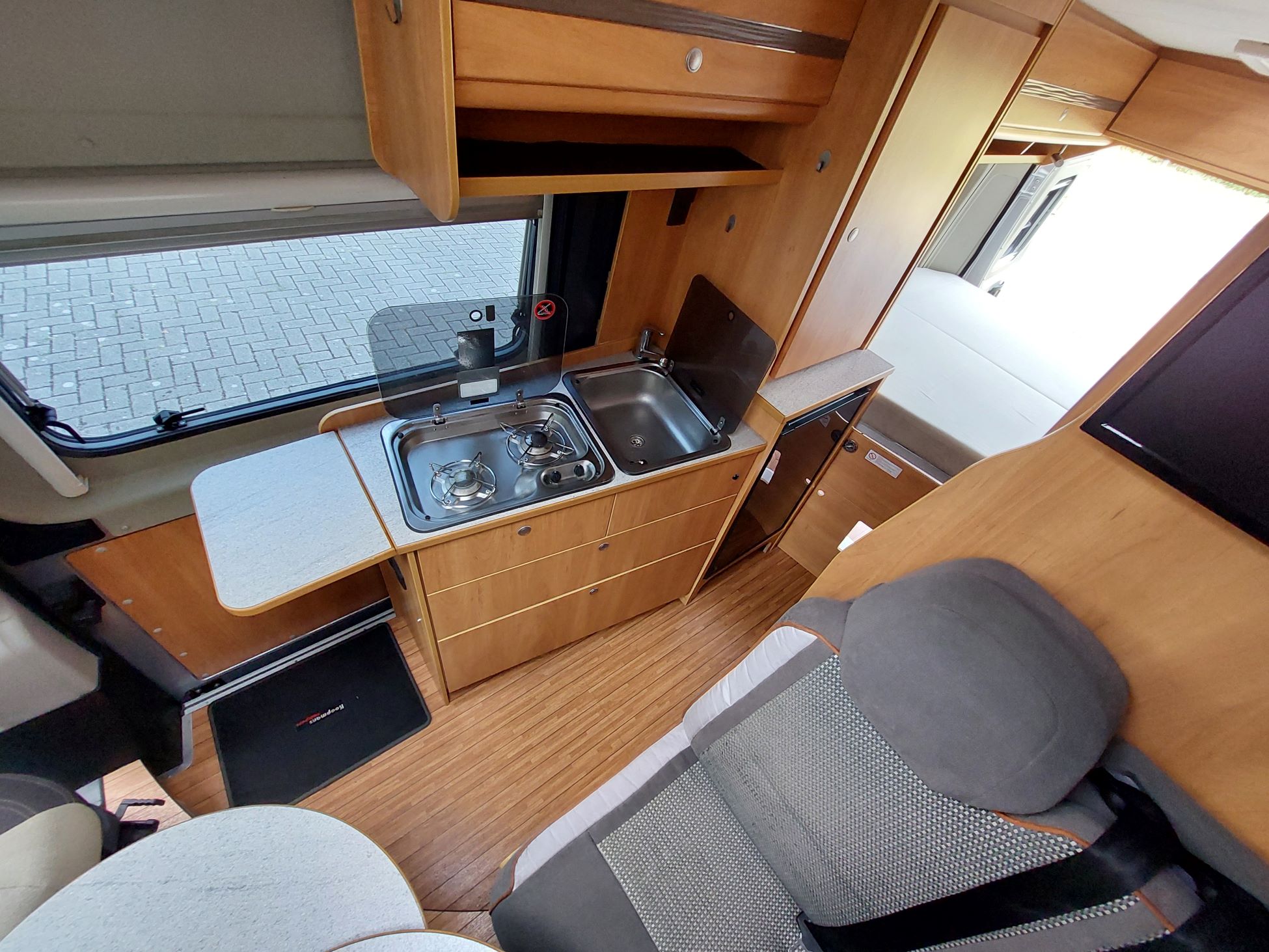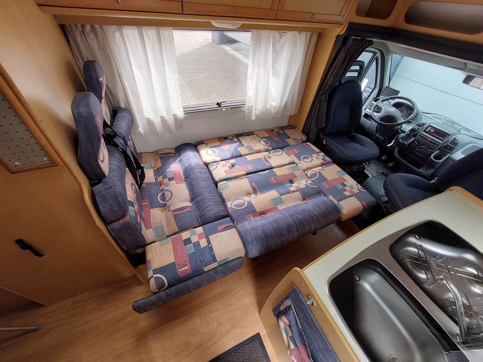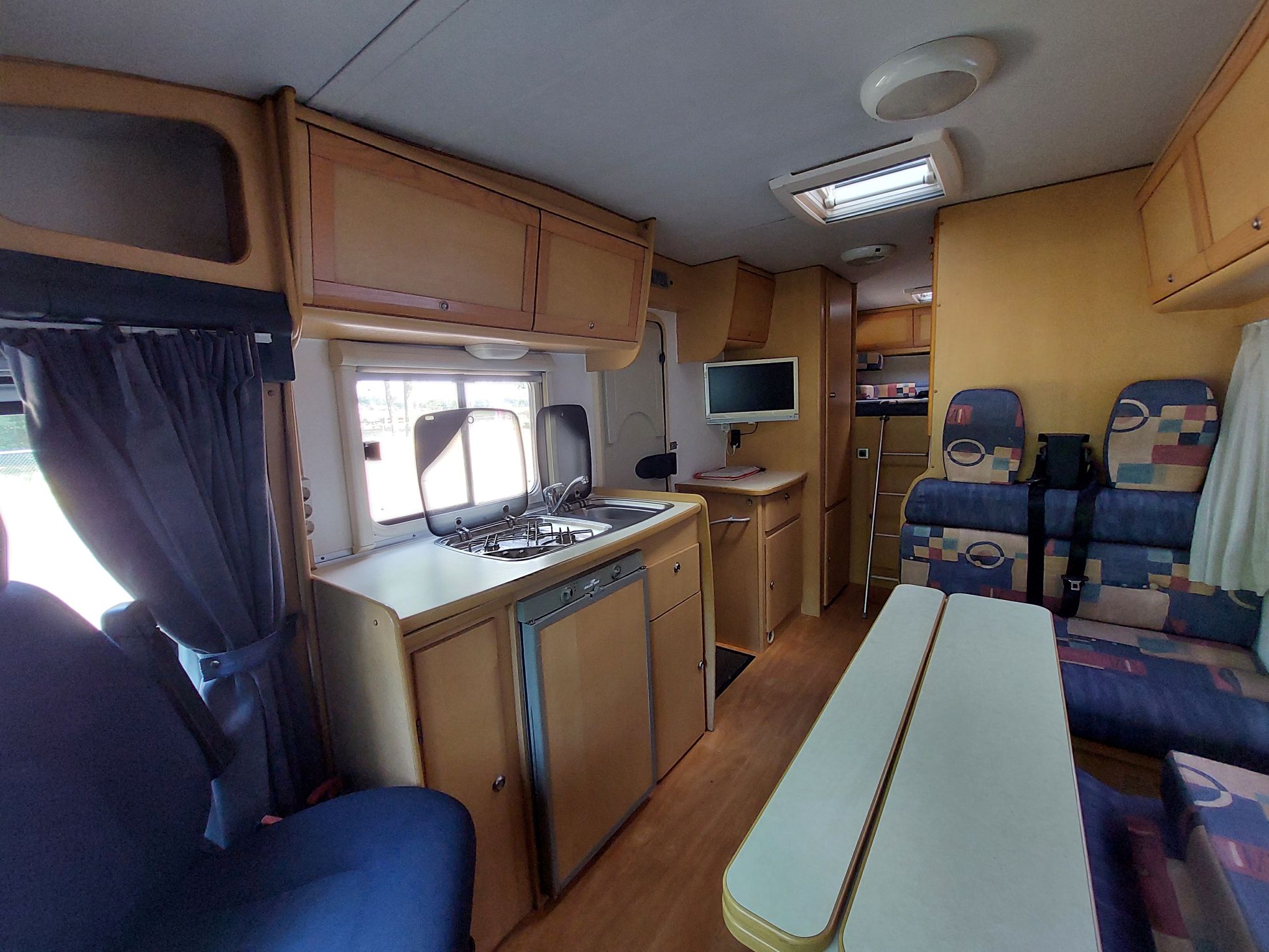Ruime halfintegraal met ruime garage, 5 zitplaatsen op kenteken, 2 bijdraaibare stoelen, vast 2 persoons bed en L zit om te bouwen tot 2 slaapplaatsen.