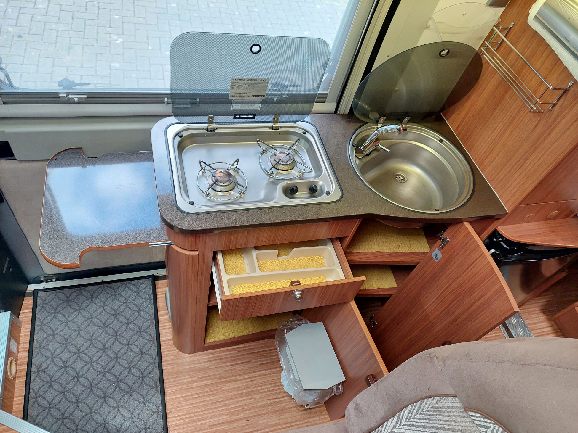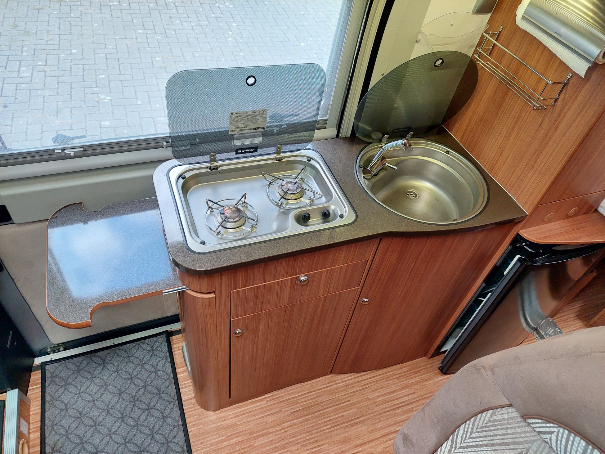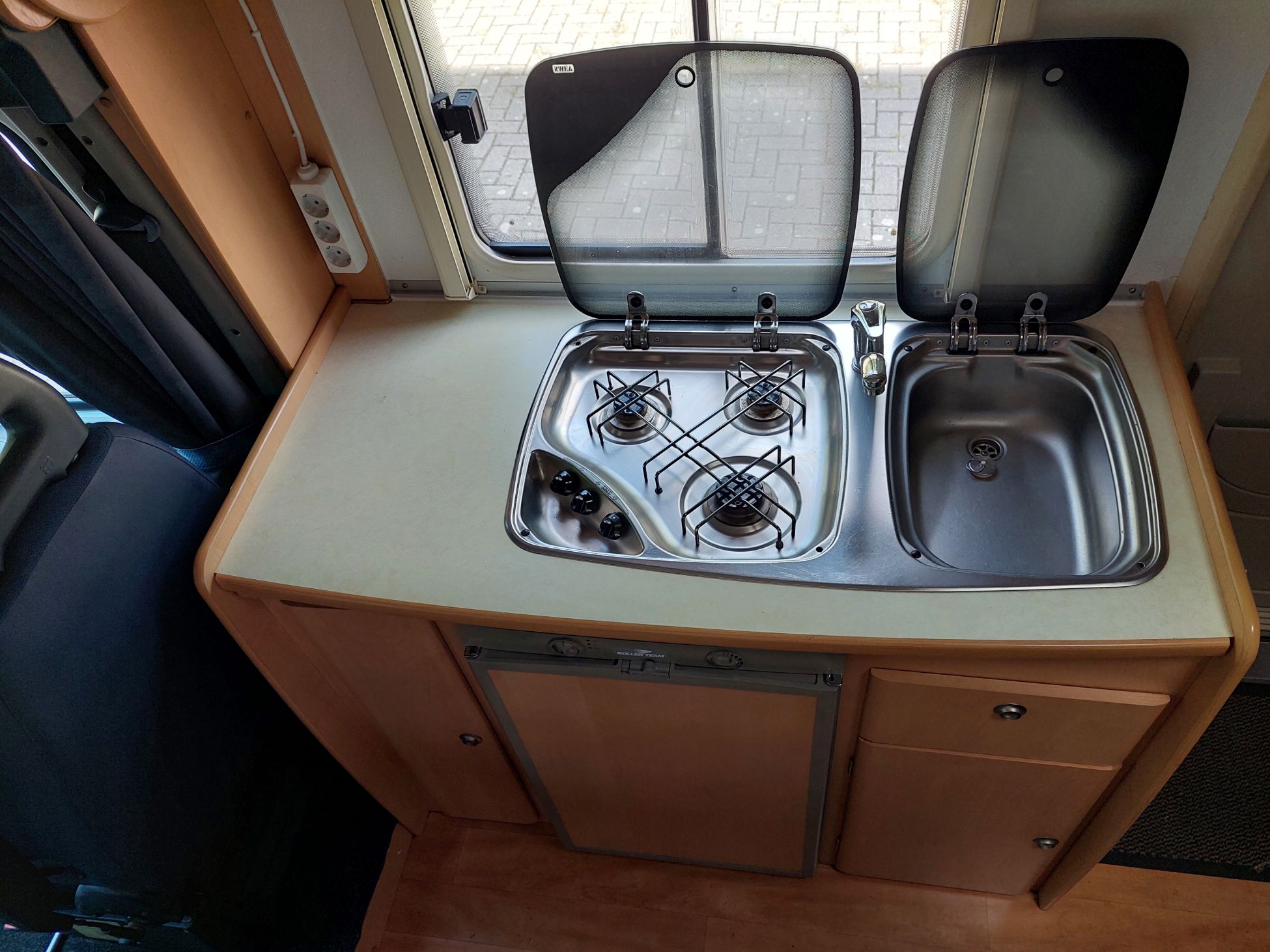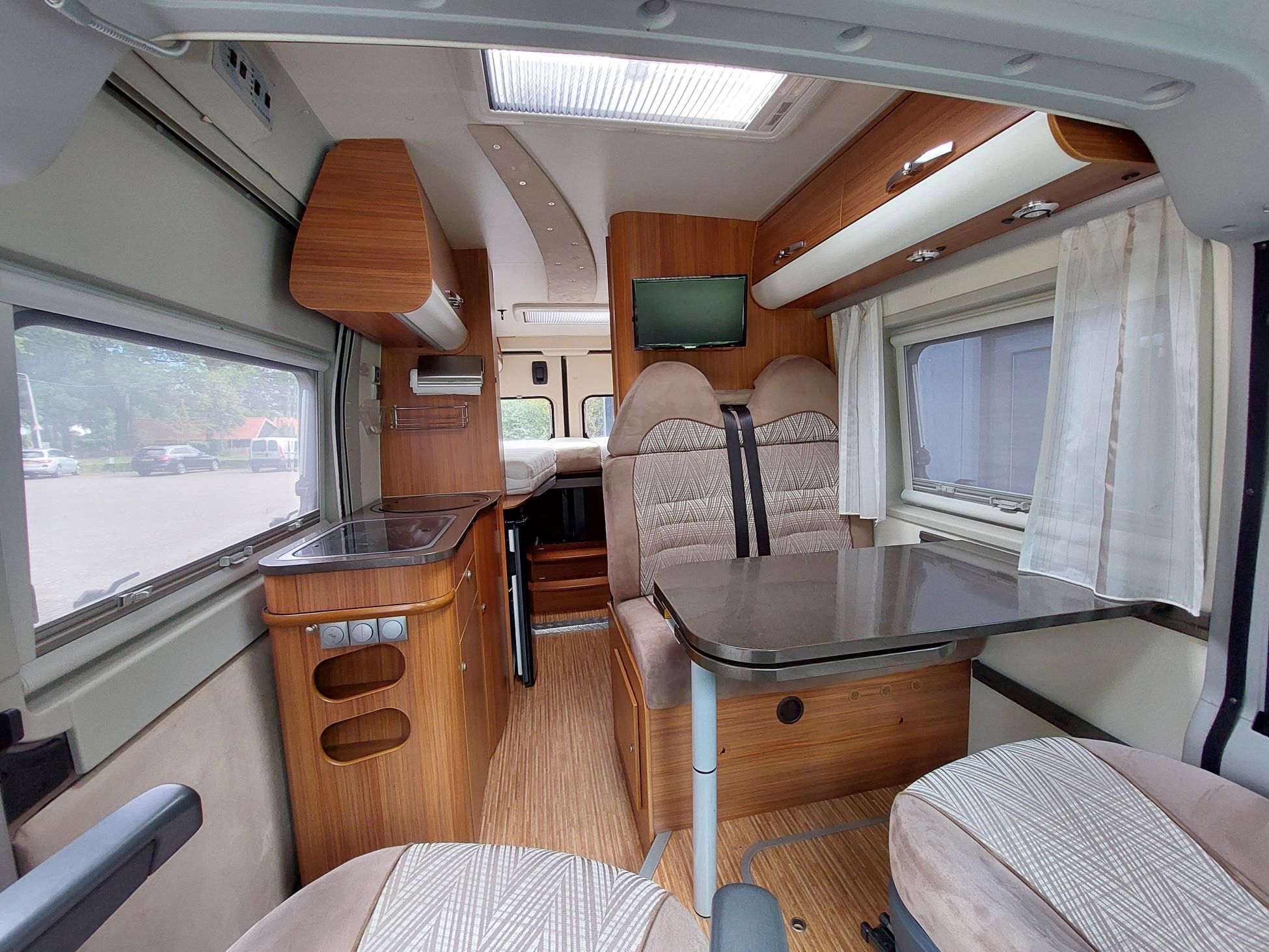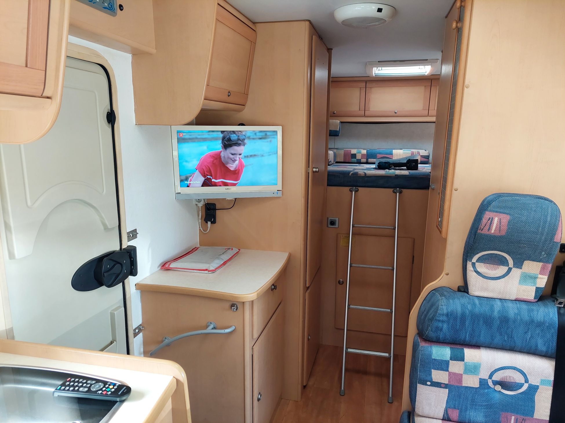 Ruime halfintegraal met ruime garage, 5 zitplaatsen op kenteken, 2 bijdraaibare stoelen, vast 2 persoons bed en L zit om te bouwen tot 2 slaapplaatsen.