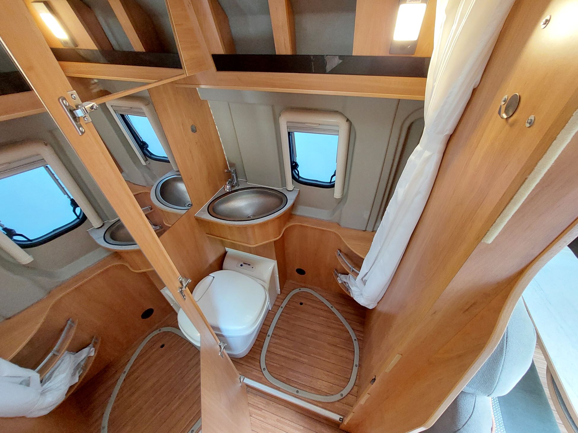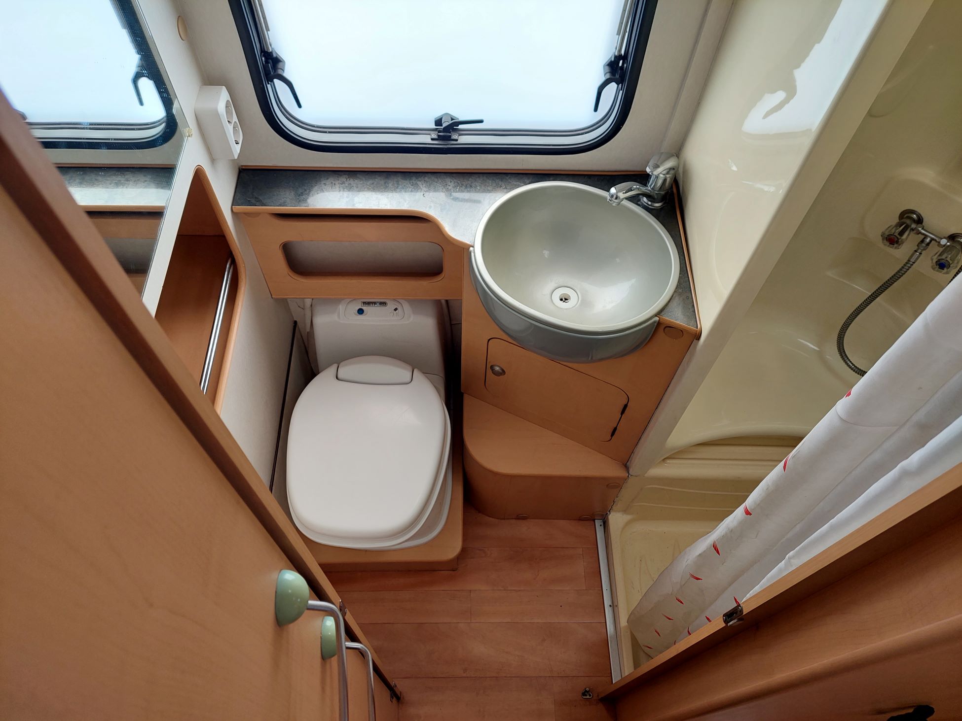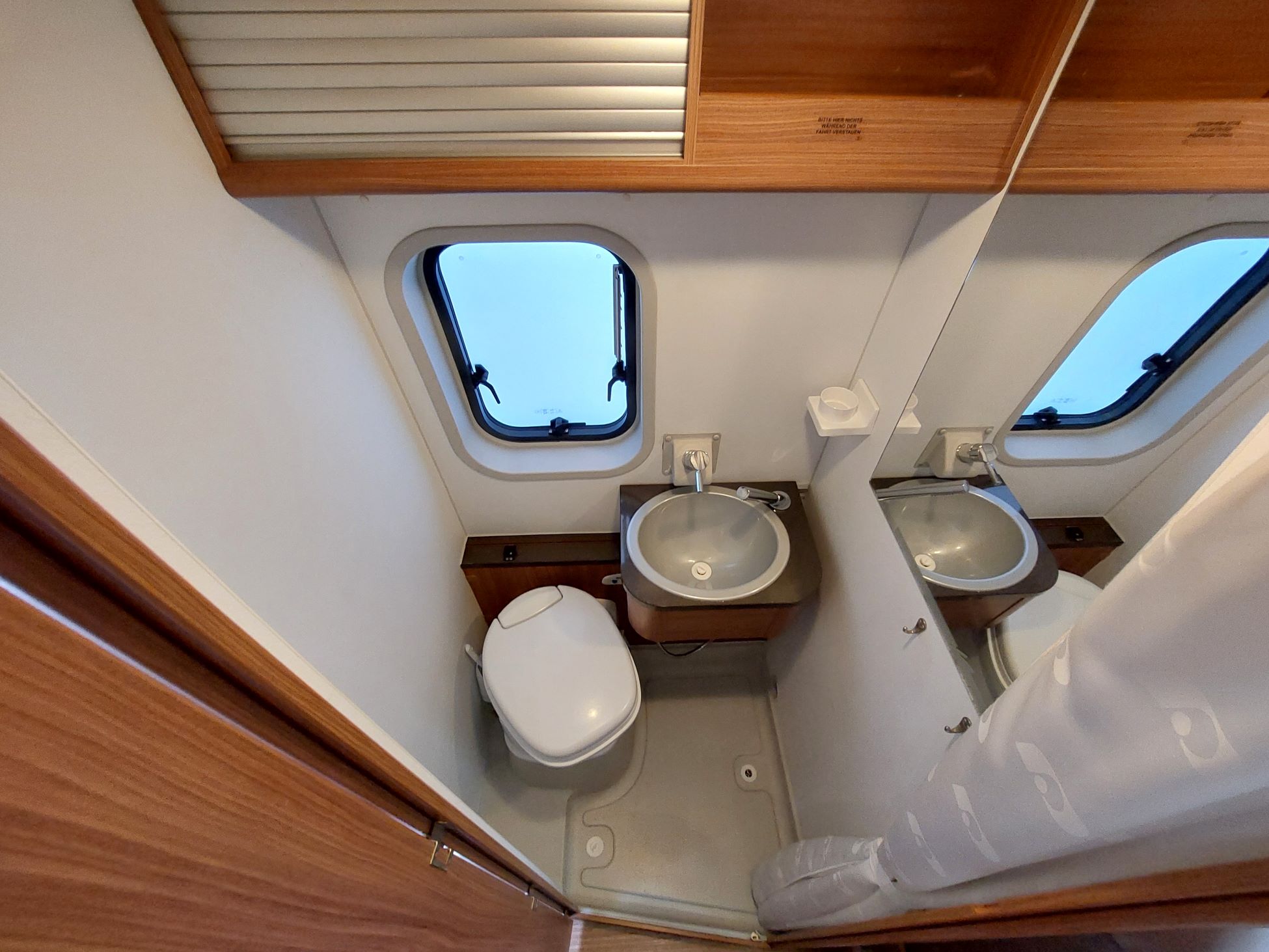 Possl 2Win R met 4 zitplaatsen op kenteken, vast 2 persoons bed en meer zitruimte door de dwarsgeplaatste WC ruimte.
