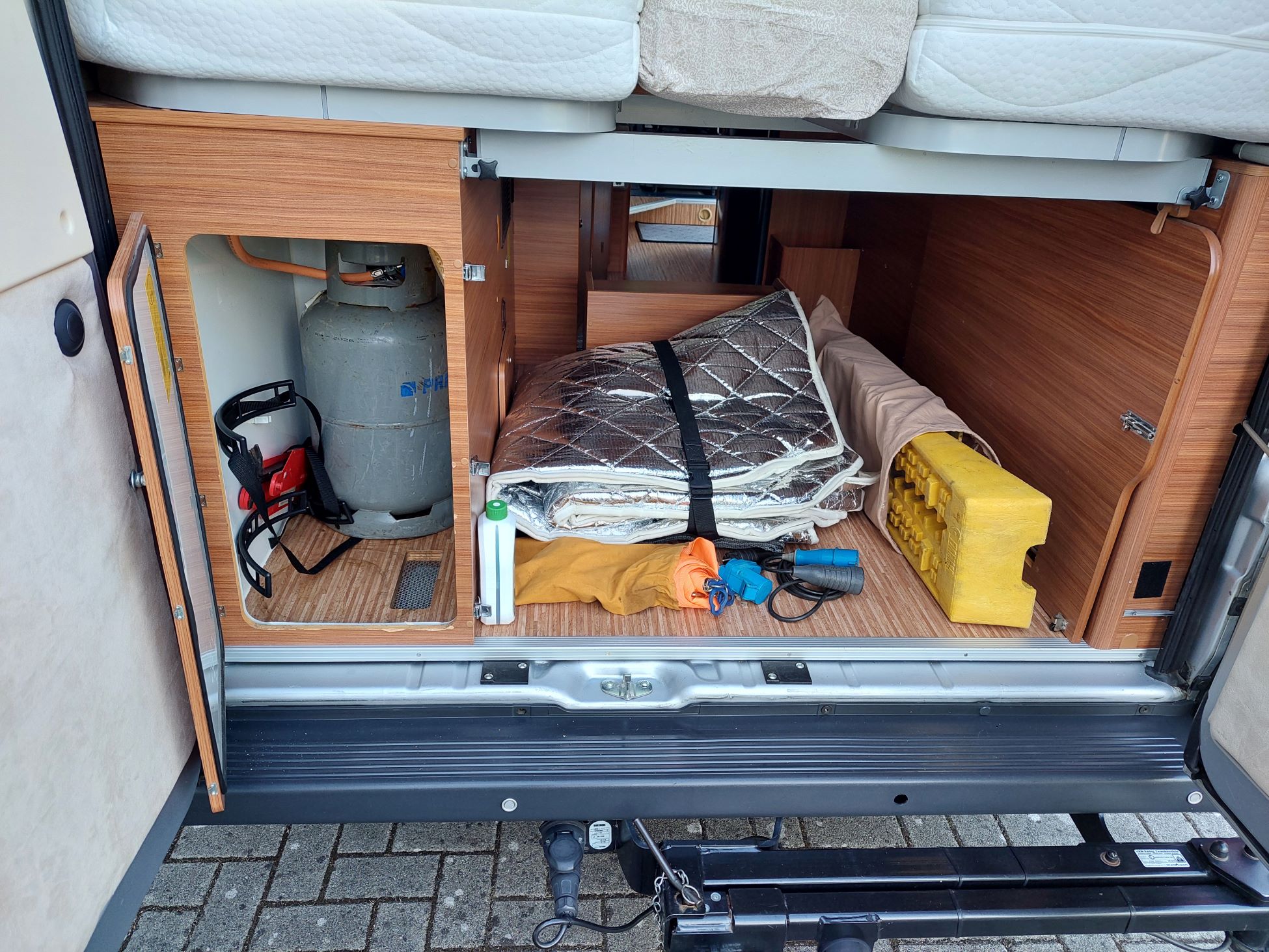 – Oprijblokken, gasfles, stormbanden, voortentkleed en stroomsnoer zitten er ook bij