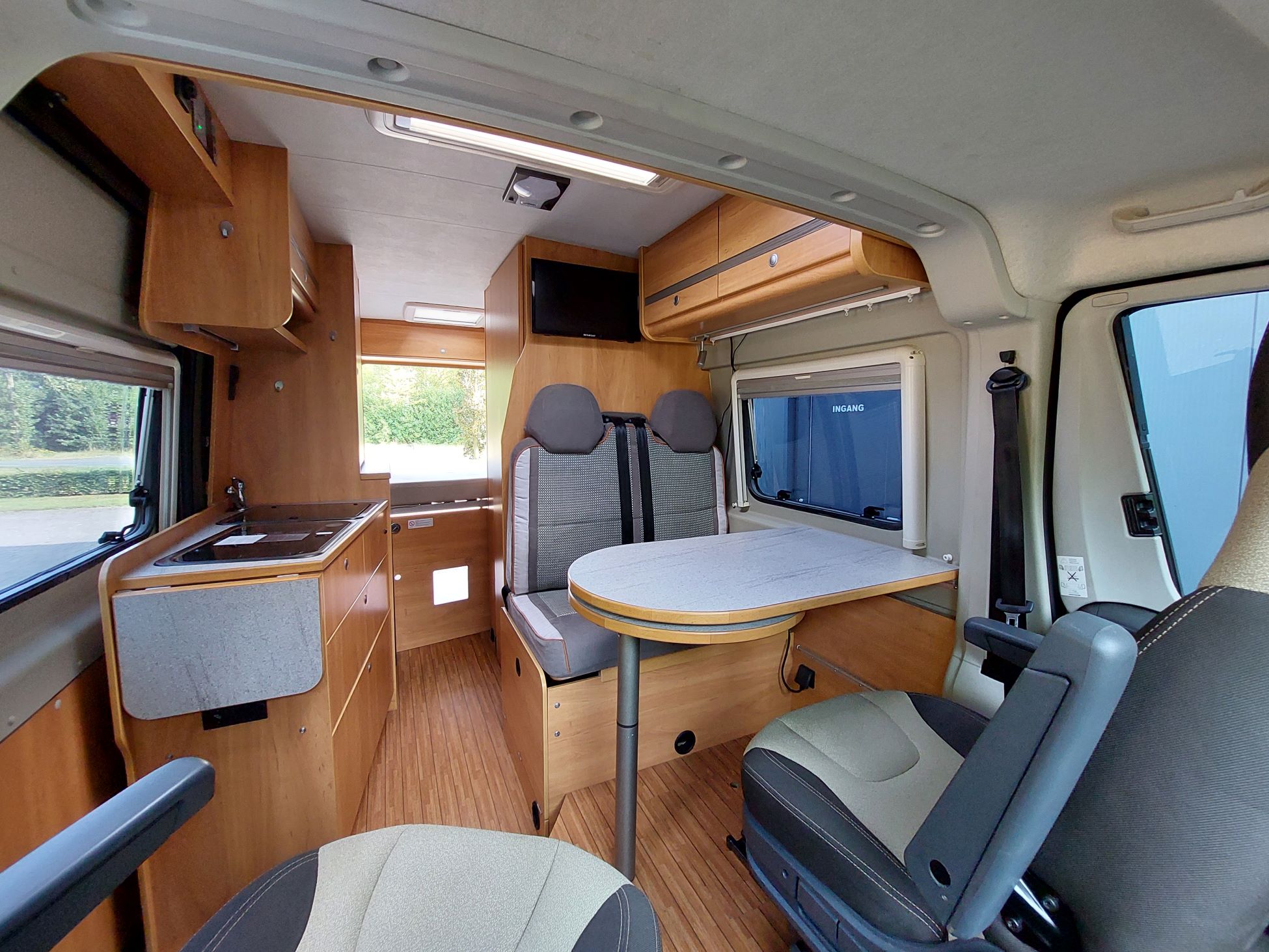 Knaus Box Star MQ Road 540 korte buscamper met vast 2 persoons bed en 4 zitplaatsen op kenteken met gordels (zitbank is in de breedte verstelbaar).